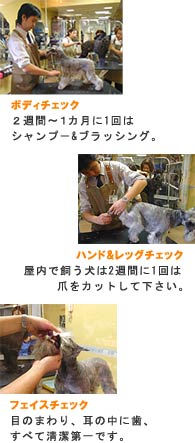 ボディ編 アトピ−性皮膚炎、湿疹などに悩む犬が増えています。ブラッシングしながら、脇の下、前胸部、内股、お尻のまわりなど、皮膚の柔らかい部分は特に気をつけてチェックして下さい。 ハンド&レッグ編 爪が伸びてくると足に負担がかかり、体全体のバランスが崩れてきます。床を歩いた時、カチカチと音が鳴る様なら爪が伸びていると思って下さい。嫌がる犬も多いので最初はプロに教えてもらいましょう。 フェイス編 目やにが出ていないか耳の中が汚れていないかをチェック。口の中は大人になってからでは、なかなか触らせてくれません。歯みがきは小さい頃から慣れさせておくのが大切です。